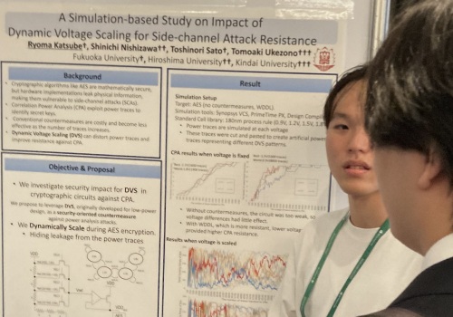 勝部さん(福岡大・M2)の論文"A Simulation-based Study on Impact of DVS for Side-channel Attacks"が採択され,ポスタープレゼンをしました.この論文は低消費電力化のためにチップへの供給電圧を動的に変動させる技術であるDVSをサイドチャネル攻撃対策として活用した場合の潜在性能をシミュレーションベースで評価し示しています.