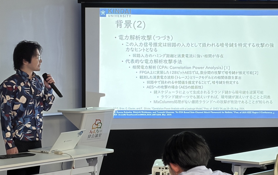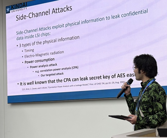 B4の平良さんの論文"The Simplest Side-channel Protection of AES-dedicated Circuit for Last-round Attack by CPA"が採択され,発表をしました.この論文はCPA(Correlation Power Analysis)として知られる電力消費波形を用いたAESへのサイドチャネル攻撃が,電力消費の漏洩モデルを活用することに着目し,特に攻撃力が高いとされるAES最終ラウンド攻撃に対して,AES最終ラウンドのフリップフロップの制御を変更することにより攻撃耐性を得たことを報告しています.